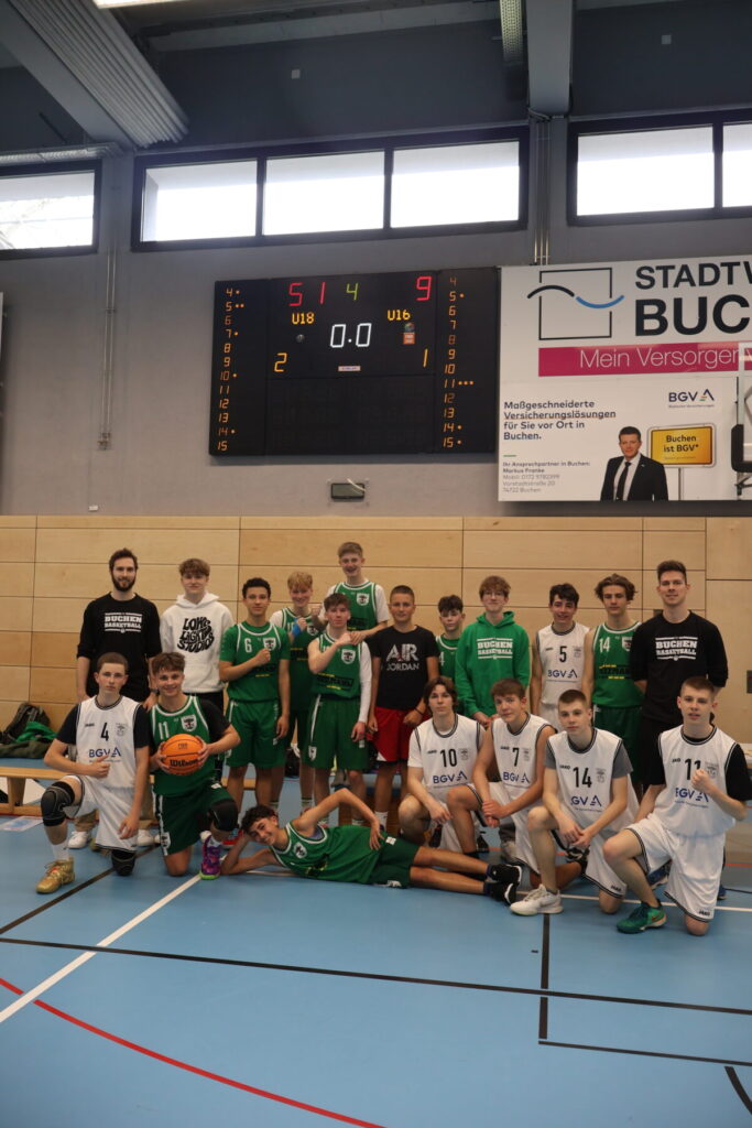 Am vergangenen Heimspieltag wartete für die Nachwuchsbasketballer des TSV Buchen direkt noch eine besondere Überraschung. Markus Franke von der BGV Buchen kam mit einem Satz brandneuer Trikots in der Halle vorbei, die die BGV der Abteilung Basketball sponsort. Für die Jugendmannschaften kommen die neuen weißen Trikots wie gerufen, benötigt man doch immer wieder, wenn etwa der Gegner mit einem gleichfarbigen Trikotsatz aufläuft, passende Trikots in einer anderen Farbe. Die neuen Trikots der BGV sind daher eine gute Ergänzung zu den grünen Trikots, die die jungen Basketballer in allen Mannschaften gut gebrauchen können. Leon Linsler nahm die Trikots gemeinsam mit den beiden männlichen Jugendmannschaften sowie deren Coaches entgegen für die Abteilungsleitung entgegen und dankte Markus im Namen der Abteilung.